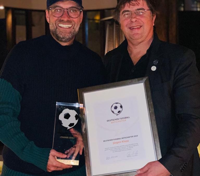 Der Liverpooler Erfolgstrainer wurde vor seiner Ernennung zum Welttrainer bereits als Deutscher Fußball Botschafter ausgezeichnet, konnte aber der Ehrung im Auswärtigen Amt seinerzeit nur per Video beiwohnen, da er sich mit dem Liverpool FC im Mai in der heißen Phase der Liga und der Champions League befand, die er später dann auch gewann.